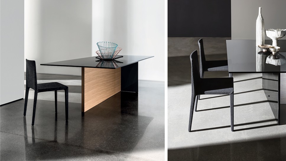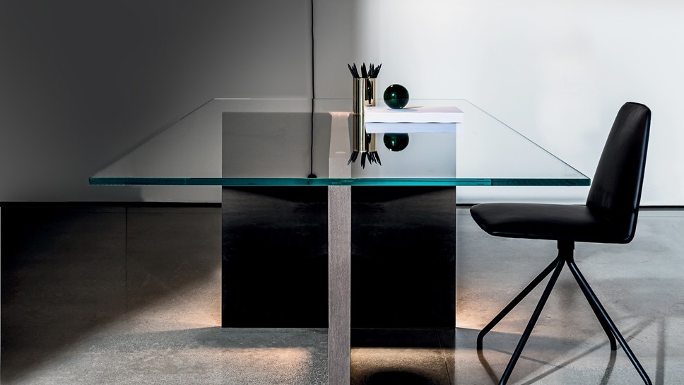 Der Abschluss aus Glas ist in verschiedenen Oberflächenausführungen erhältlich, während der Unterbau schichtweise aus Glas und aus schwarz lackiertem Holz gefertigt ist.