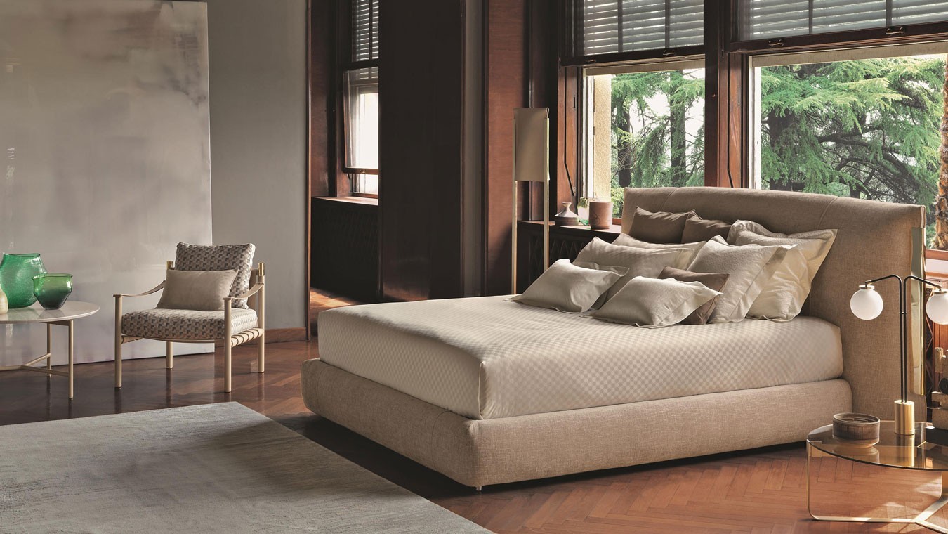 Flou's Amal bed stands out for its class as it is embellished with elegant metallic trims. The metal trim on the sides of the headboard “anchors” the cover, exalting the softness of the ensemble. The three finishes of the trim are available in polished gold, matt burnished, polished black nickel, and match the range of cover materials available. The covers of the base and the headboard are totally removable and available in fabric, leather or Ecopelle. It can be combined with the electric base Leonardo
