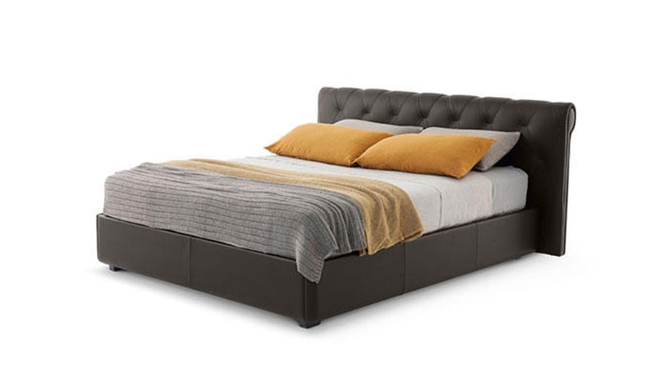 On the headboard, upholstered in Pelle Frau® leather, the modern capitonné effect through subtle stitching creates a simple décor with large diamond motifs.