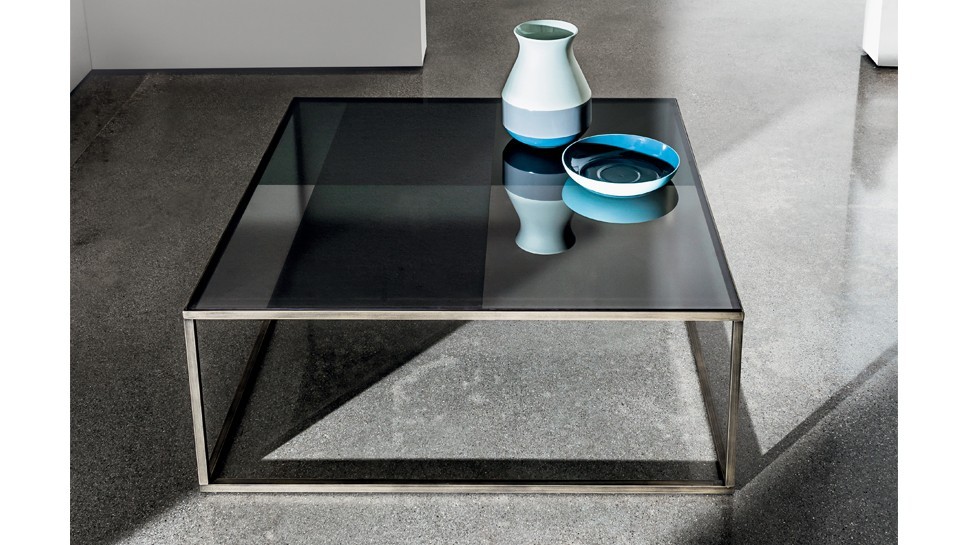 It features a lacquered metal frame while the glass top is also available also with mirrored or frosted mirrored version, smoked or bronzed finish.