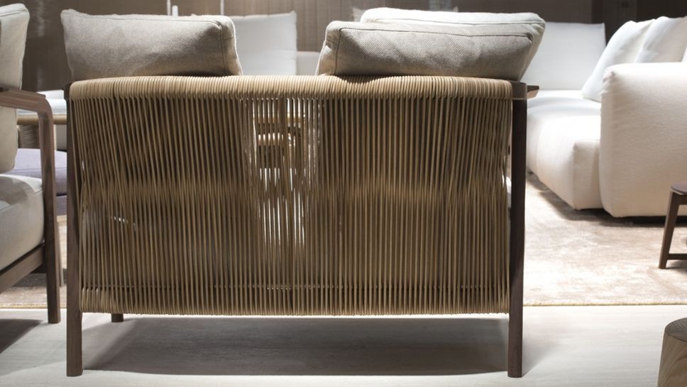 Reinterpretazione contemporanea della classica poltrona anni '40, con braccioli in legno curvato, struttura in legno massiccio e imbottitura di schienale e seduta. Crono si distingue per la preziosa lavorazione a intreccio di cordoncino in cuoio dello schienale che la rende del tutto originale.