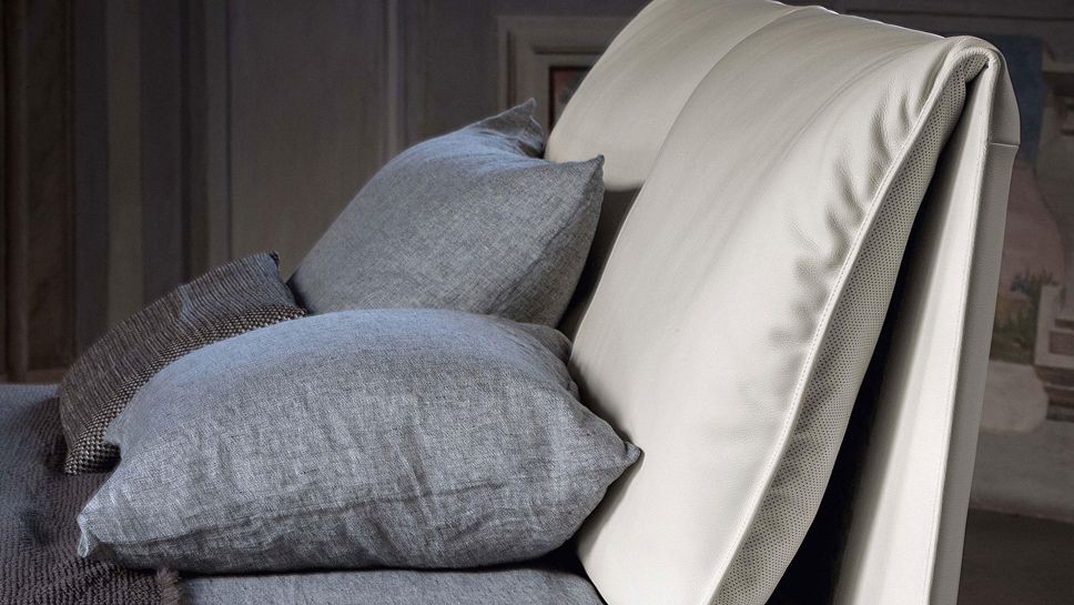 Letto disinvolto ed elegante, che riprende l'omonimo divano negli eleganti movimenti di superficie dei cuscini della testata. Il rivestimento in pelle è impreziosito da delicati giochi di pieghe ottenuti grazie a meticolose lavorazioni artigianali.